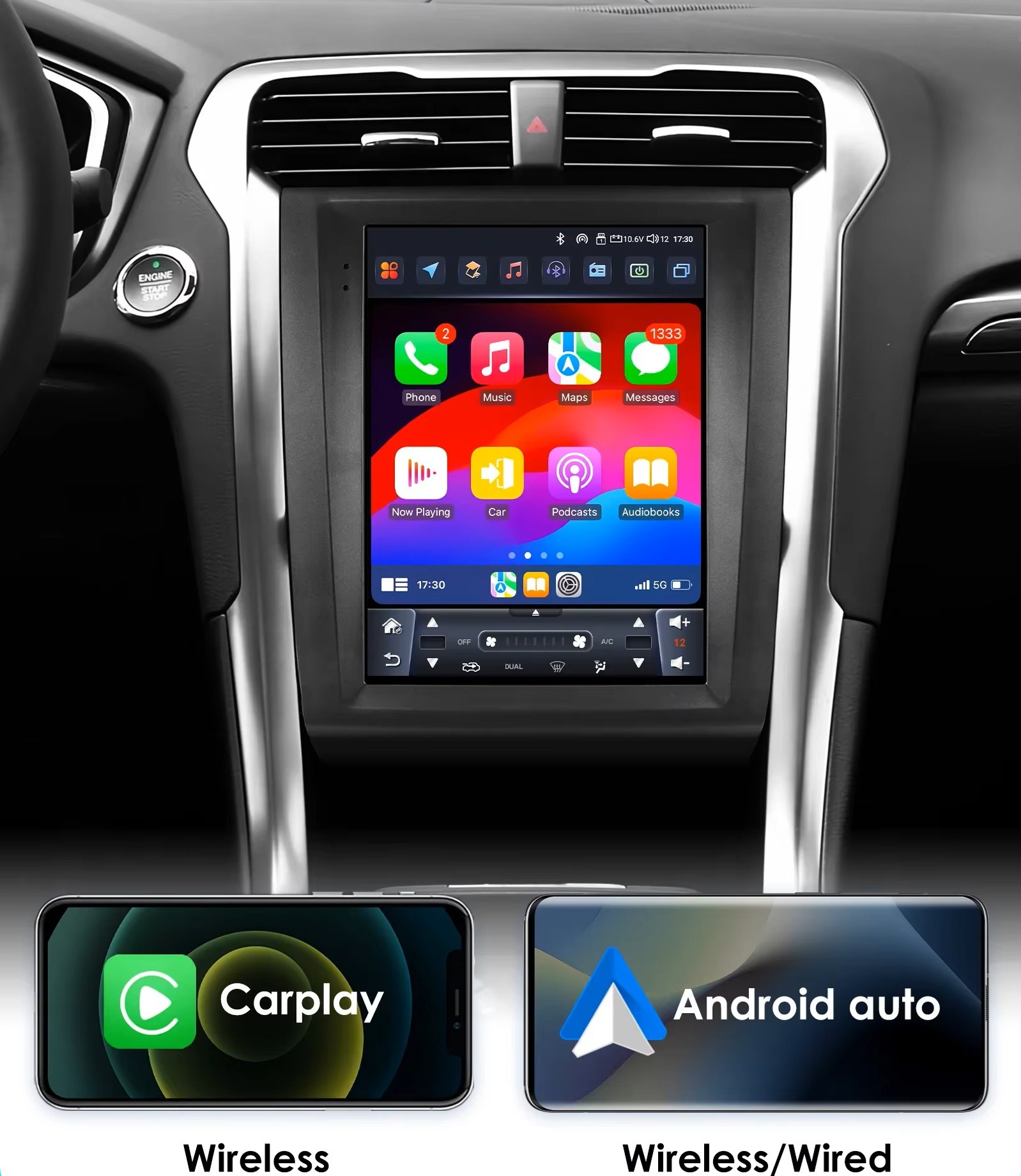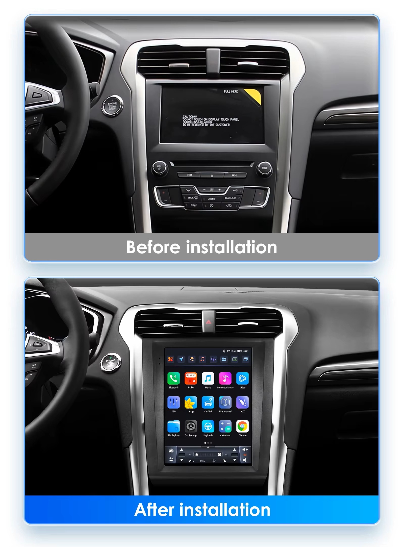 Ford Mondeo (2013-2019) Tesla Style Android Multimédia, amely tökéletesen illeszkedik a gyári rádió helyére. Minden Canbus funkcióval kompatibilis. (autó adatok megjelenítése, kormányvezérlés, ajtó nyitás kijelzés, parkoló radar grafikus megjelenítés, klíma kontroll panel megjelenítés, gyári tolatókamera is illeszthető hozzá)